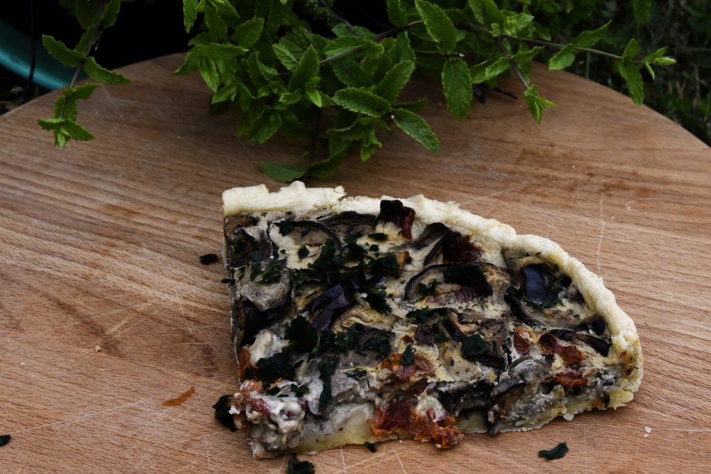 Bis dahin ist der Teig bestimmt kalt genug und lässt sich gut ausrollen. Einfach in eine gefettete Springform legen und den Rand gut andrücken. Ich habe immer große Freude daran, die Auberginen in einem Muster auszulegen. Dann kommt nur die Eiermasse obendrüber und schwupps geht es bei 180°C in den Ofen. Umluft lässt die Quiche luftig werden. Die fertige Quiche ist obendrauf leicht braun und braucht oft 40 Minuten im Backofen. Der Stäbchentest hilft! Passt perfekt zu einem Salat der Saison!